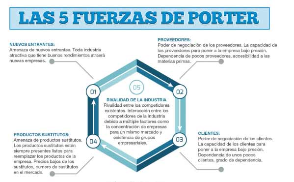 5 FUERZAS DE PORTER: posiblemente el menos popular de la lista pero no deja de ser una buena herramienta que se basa en darle valor a 5 factores: poder de negociación de los proveedores, de los clientes, rivalidad de la competencia, entrada de productos sustitutos y amenaza de nuevos entrantes.